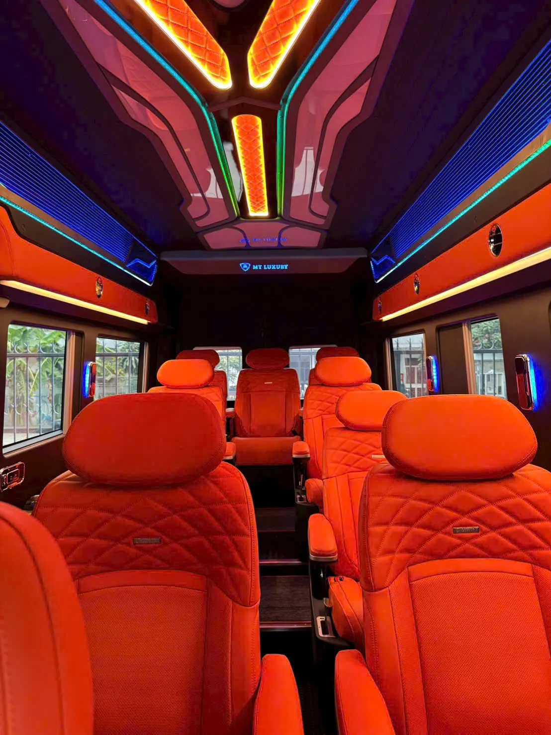🎬 Giải trí cao cấp | Màn hình Android, loa cao cấp, hệ thống đèn trần LED đa màu, cổng sạc USB cho từng ghế |