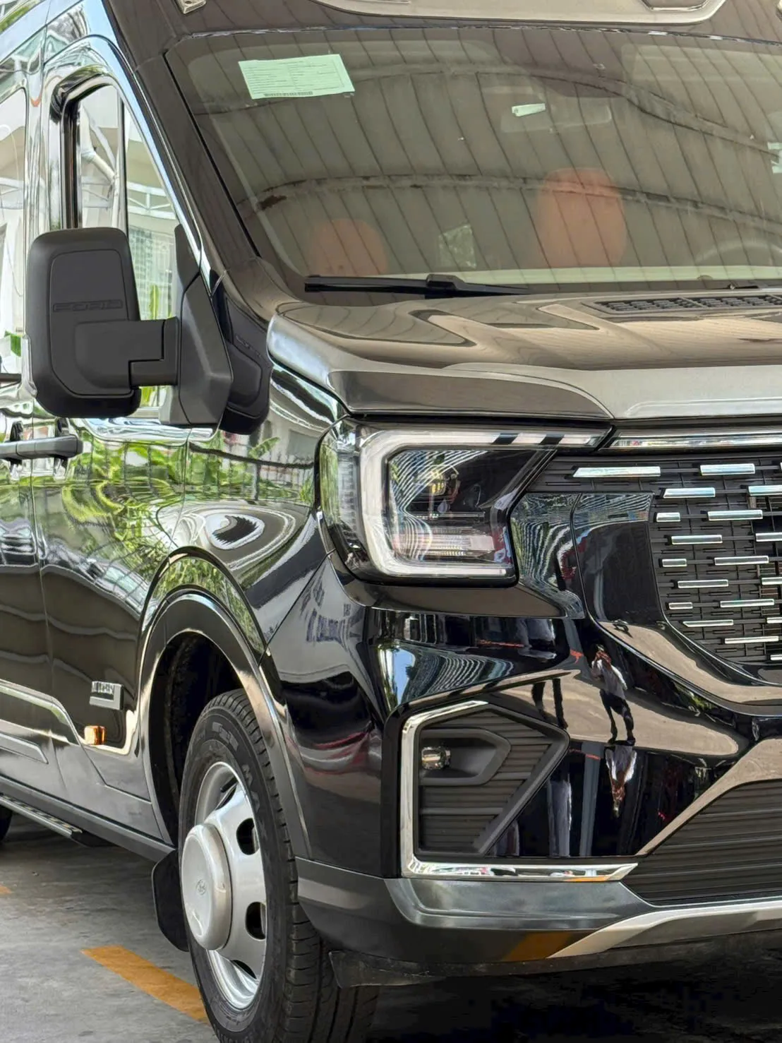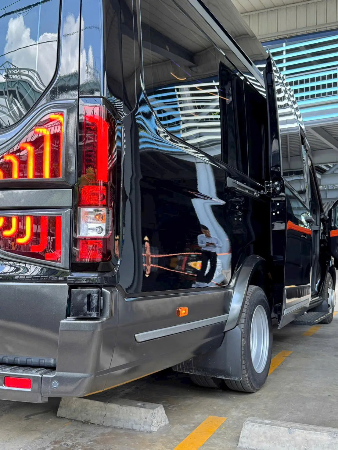 Thân xe được phủ sơn cao cấp theo phong cách xe doanh nhân, bề mặt sơn bóng gương tạo cảm giác sang trọng tương tự các dòng MPV hạng sang. Cửa lên xuống dạng điệngiúp hành khách ra vào xe dễ dàng hơn, đồng thời tăng thêm sự tiện nghi khi sử dụng cho dịch vụ đưa đón cao cấp. Ngoài ra, xe còn được trang bị bánh đôi phía sau, tạo dáng mạnh mẽ và cứng cáp hơn. Hệ thống kính cách nhiệt tối màu không chỉ mang lại tính riêng tư mà còn giúp không gian nội thất mát mẻ hơn dưới trời nắng nóng.